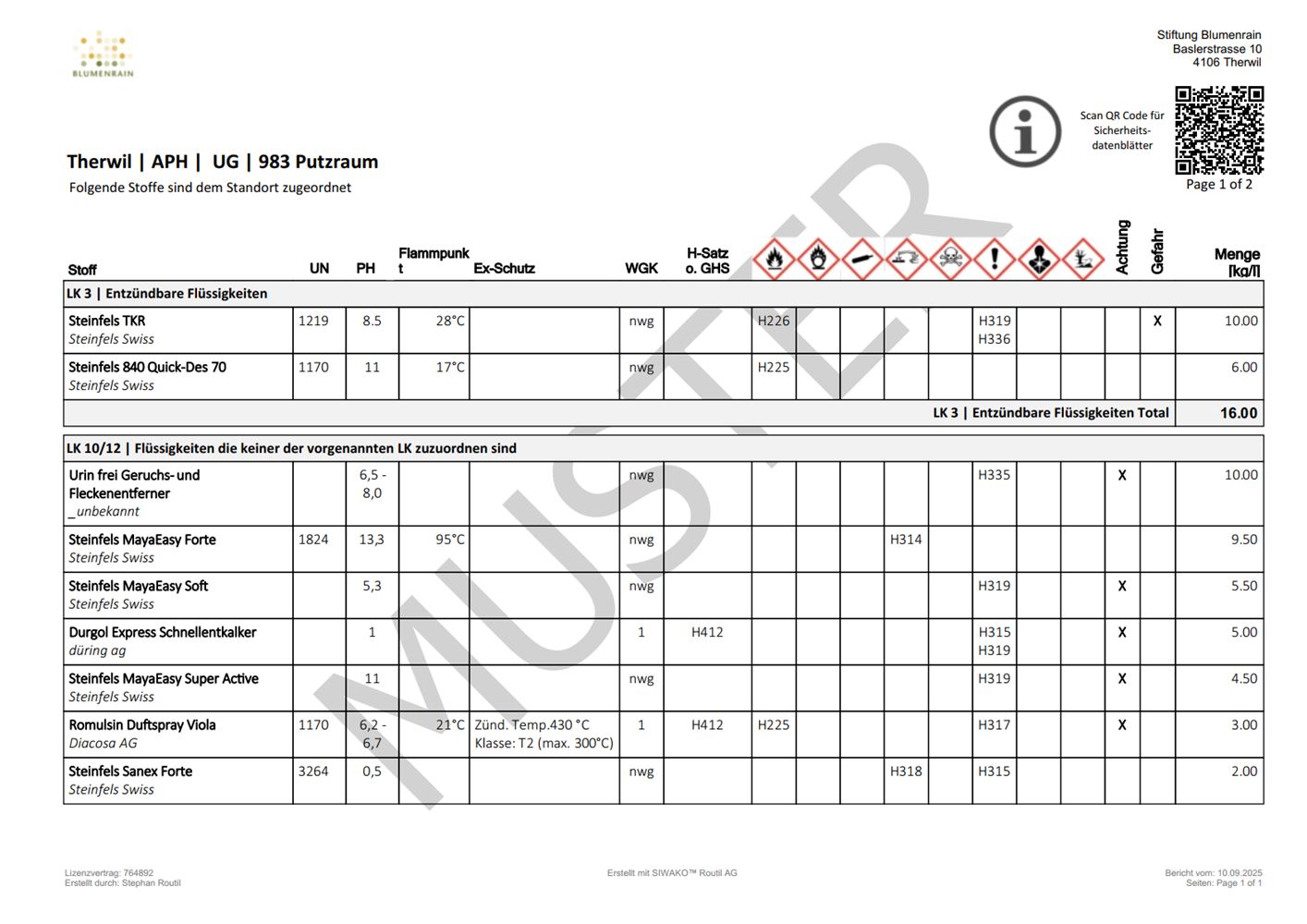 Die generierte Inventarliste kann direkt am Standort, beispielsweise an der Türe zum Lagerraum, angebracht werden. Damit haben Mitarbeitende und die Feuerwehr jederzeit Klarheit darüber, welche Stoffe vorhanden sind und welche Gefahrenmerkmale zu beachten sind. Das erhöht die Sicherheit im Alltag und im Ereignisfall.